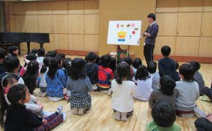 子どもたちはいつも遊んでくれる学生さんがみんなの前で話をするので興味津々でした。