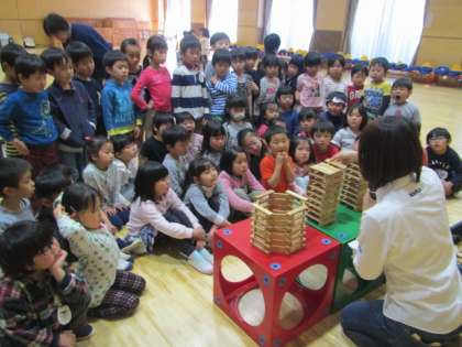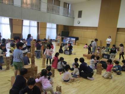 カプラ専門スタッフの方に来ていただき、とてもたくさんのカプラを使って遊びました。カプラのいろいろな使い方や積み方を教えていただき、子どもたちは興味津々で話を聞いていました。