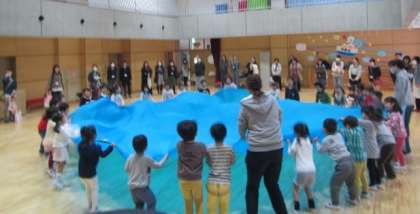 3歳児は2クラスのみんなで集まることを楽しんでいる様子を参観していただきました。