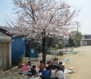 園庭の桜が早くも咲き始めました。今日のなかよしタイムのお弁当は,ぽかぽか園庭で,お花見弁当!「外で食べたらおいしい!」と楽しく食べました。
