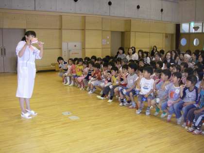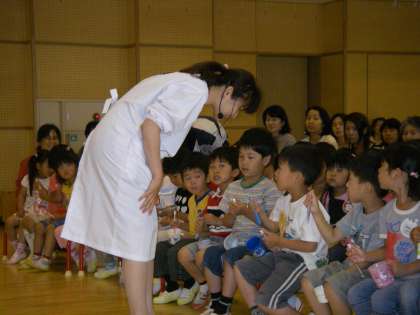 虫歯のなりたちについて紙芝居を見たり,歯ブラシの正しい持ち方や磨き方について教えてもらったりしました。さあ,これでみんな歯磨き名人になったかな?
