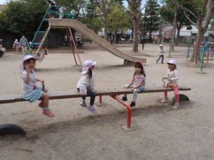 公園ではシーソーに乗ったり,たくさんの友達と連なってすべり台をすべったり,しっぽ取りをしたりして思い切り体を動かして遊びました。