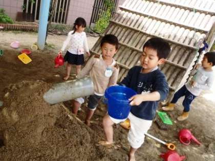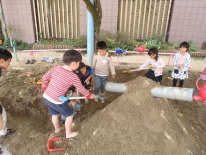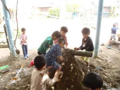 5歳児ゆり組の子どもたちは,今日は大きな山づくりをして遊んでいました。