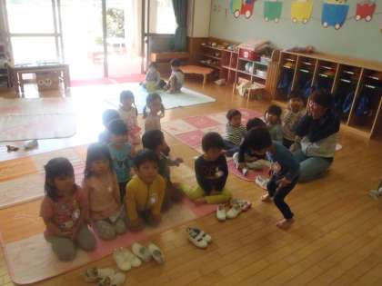 3歳児もも組の子どもたちは,幼稚園で初めての発育計測を行いました。保育室に身長や体重を計測する器具が持ち込まれると,ござの上で興味津々に見つめていました。自分で着替えられるところは頑張りながら,できないところは保護者に手伝ってもらいながら,親子で一緒に参加し,大きくなったことを喜んでいました。