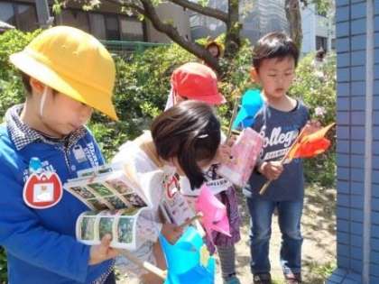 年中組の子どもたちが,風車を持って園庭を駆け回っていると,「ピピピピピ」と風車がアンテナに変身!「たんぽぽあった!」とAくんがたんぽぽの花を見つけました。「次はこっち!ピピピピピ」とAくんが走って行った先に見つけたのはツツジの花「これは何の花?」とAくん。Bちゃんが「ツツジかな〜?」とこたえました。「部屋に図鑑があったよね!」と教師が言うと,「もってくるわ!」と子どもたち。首にかけられる自然図鑑と風車をもって自然見つけ探検が始まりました。