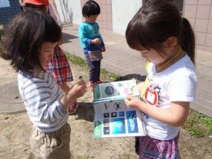 「これはなんの花だろう?」と次々と花や草を見つけては図鑑で調べます。友達が「あった!」「これかな?」と言うと,みんなで図鑑を覗き込んでいました。「汗かいてきちゃった。」と言いながら,1日中図鑑を持って園庭を駆け回って遊びました。