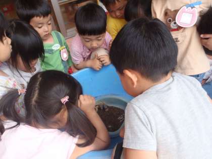 たらいの中にいる幼虫を見ようと,周りを囲んで覗き込んでいます。恐る恐るつついてみたり,「暑いんちゃう?」と土をかぶせてみたり,じーっと様子を眺めていたり…と様々なかかわりをしていました。