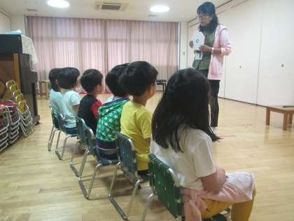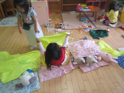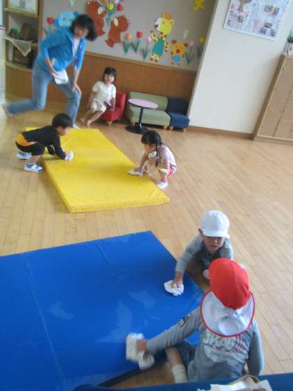 今日は朝から雨ふり。5歳児が視力検査と聴力検査をしています。保健の先生の話を真剣に聞く姿がかっこいい!4歳児の保育室では,やさしく布団をかけてぬいぐるみを寝かしつけています。「病院やで」「私も寝るわ」と楽しそうです。廊下では3歳児が,先生と一緒に廊下で遊ぶためのマットをきれいに拭き始めました。「僕もやりたい!」拭き掃除も楽しい遊びの1つになっています。きれいになったマットの上でジャンプしたり転がったり,いろいろなクラスの子どもたちが一緒になって遊んでいましたよ。
