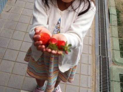 園庭で育てていたイチゴが,真っ赤に色づきました。