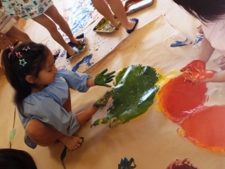 手や足にたくさん絵の具をつけ,