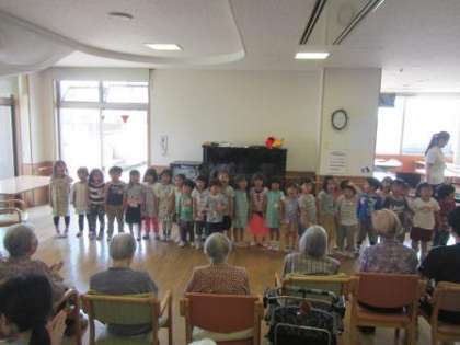 今日は,年中児ばら組の子どもたちが初めて隣の特養さんへ訪問させていただきました。