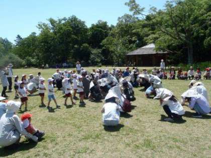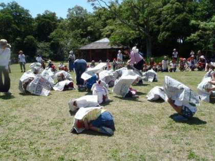 広い芝生で,かけっこや新聞紙を使ったかくれんぼをして遊んだ後,親子で植物園のウォークラリーを行いました。たわしみたいな花や,いい香りのする黄色いバラなど,ウォークラリーカードのヒントを頼りに植物園の自然に触れて楽しみました。ゴールの芝生広場では,園長先生にキラキラのシールをもらいましたね。