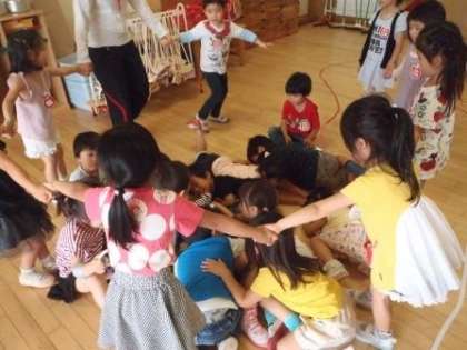 そこで,わたしたちもカレーをつくっちゃおう!と教師がトントンと野菜を切る真似をしました。すると,「わたしたちでお鍋ってことにしよ。」と立ち上がったAちゃん。「みんなでしよ!おっきいお鍋にしよ。」と手をつないで円になりました。すると,「ぼくにんじん。」「お鍋の中に入っちゃお,ぽ〜ん。」と円の中に入る子どもたちも現れました。