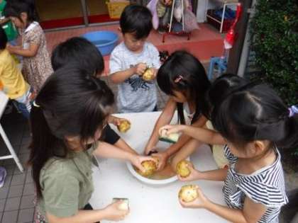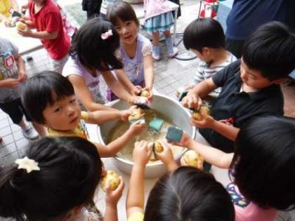 洗うことは笑顔で楽しんでいた子どもたちでしたが,スポンジでこすって皮をむくには力がいります。「けっこう難しいな。」「かたいわ。」と段々表情にも力がはいっていく子どもたちでした。