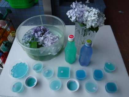 色水遊びでできたサイダーやゼリーの色がとっても涼しげで,きれいでした。アジサイの花と一緒に並べてあり,今の季節にぴったりだなあと感じます。
