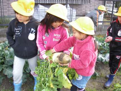 さすがゆり組。頑張って歩きました。お土産の大根,お家でのお料理が楽しみですね!