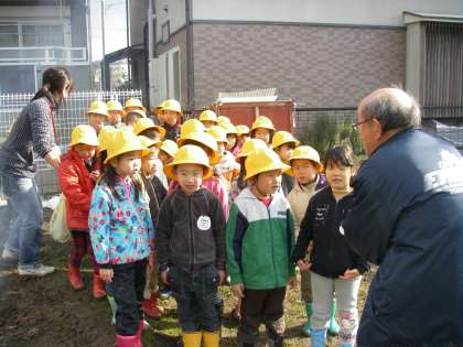 お手伝いのお母さん先生に一人ずつの大根を袋に入れてもらった後,幼稚園では,今日が西賀茂農園に来るのは最後なので,いつも西賀茂農園のお世話をしていただいたり,いろいろ教えていただいた地域の先生にお礼を言いいました。
