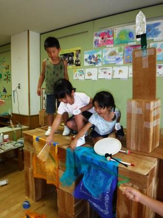 自分たちも鉾に登った経験から,鉾を新たにつくり変え,今日見た様子を再現して遊んでいました。
