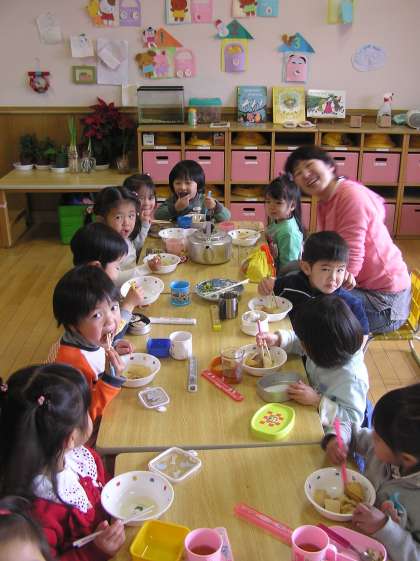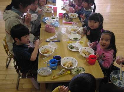 お昼は,幼稚園のみんなで大根のおでん風煮物をおかずに,お家から持って来たご飯を食べました。