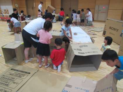 遊戯室をいっぱい使って、段ボールで遊びました!