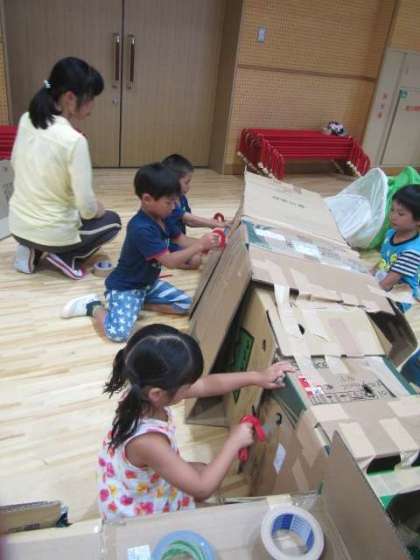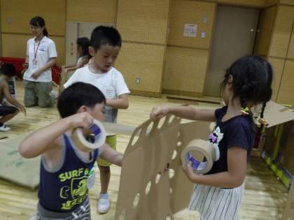 テープを切る指先の使い方、接続部分に必要な長さ、段ボールカッターの力の入れ具合など、作りながら、手先指先だけでなく、足や腕で段ボールを抑えて体全体で迷路を作りました!