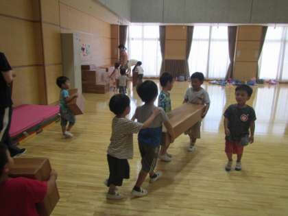 廊下に出していた積木をなかよしタイムに来ていた子どもたちの力を借りて遊戯室に運び込みました。もも組さんも三角の積木を上手に運びます。ばら組、ゆり組の子どもたちも一人で運んだり、友達と力を合わせて運んだりしました。みんな、夏の間に、身長や体重だけでなく、力もついたようです!