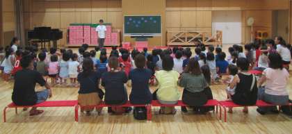 暑い夏にお誕生日を迎えた友達を紹介し,5歳児が代表でプレゼントを渡します。