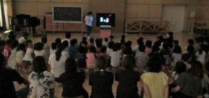 3歳児の子どもたちも暗い中で見るブラックシアターに興味津々でした。1学期にはなかった瞳の輝きに,夏休み中の成長を感じました。