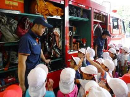 消防車を見せてもらったり,色々質問をして消防士さんに教えてもらったりしました。