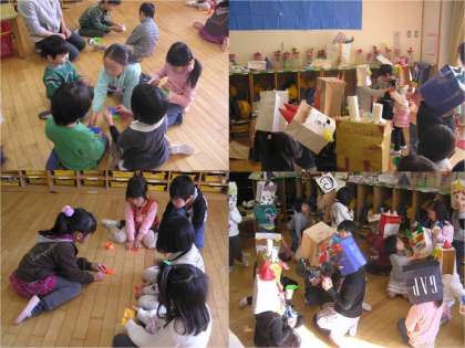 ゆり組のお兄さん,お姉さんが先生になって,「三宝」の折り方を教えてくれているのですね。ははぁ,節分の豆を入れる入れ物を作っているのですね。