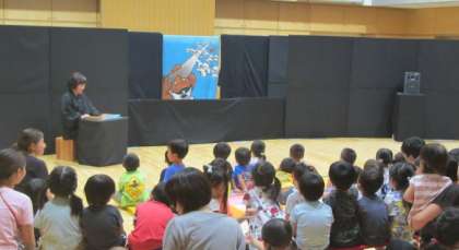次の「ちからたろう」のお話は,昔話の語り口調や,工夫された舞台装置に,子どもたちはお話の世界に引き込まれていきました。うさぎ組,ひよこ組の子どもたちも,ちょっとドキドキしながら,おうちの人の膝の上で楽しんでいましたね。(もしかすると,おうちの人のほうが,昔話の世界を楽しんでいただいていたかもしれません。)