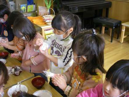 「できた〜」「おいもの時みたいにギュッギュッてしたよ」おいしそうなおにぎりをたくさん作りました。