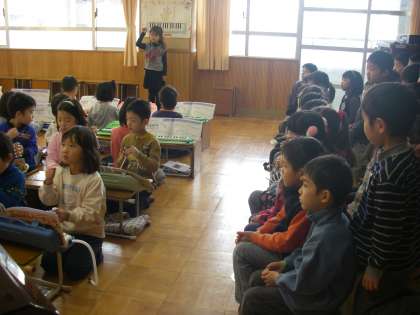 音楽では,鍵盤ハーモニカやスズ,タンバリンなどを使って指揮者を見ながら合奏をするという授業内容でした。ゆり組の子どもたちも今,いろいろな楽器を使って合奏を楽しんでいる所なので,すごく刺激を受けたのではないかと思います。