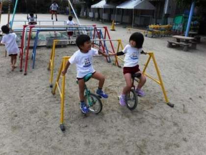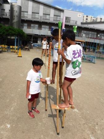 5歳児ゆり組は「竹馬をもっと高くしたい!」と高い竹馬でショーごっこに挑戦しています。その横では,ゆり組と同じ飾りをつけて,4歳児ばら組が一本歯下駄でショーに挑戦です。