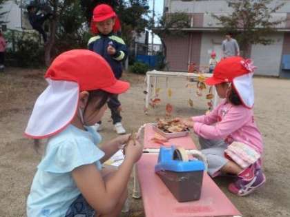今日は,そんなきれいな落ち葉で風に揺れる飾りをつくりました。