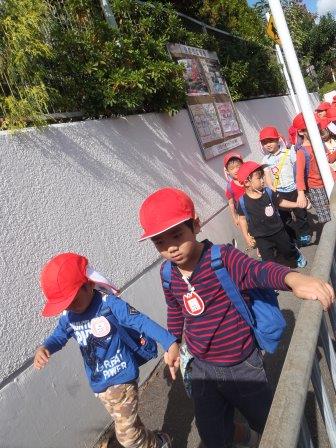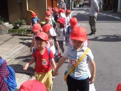 幼稚園の近くの散歩ですが,近くのお店の方に「こんにちは」と声をかけると手を振ってくださったり,メダカを見つけたり,きれいな花や紅葉を見つけたりして,楽しいお散歩でした。
