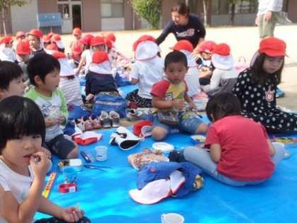 そして,幼稚園に戻り,遠足気分で広場でお弁当を食べました。