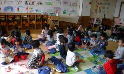 大きい組の部屋で食べるのはちょっとドキドキしたようですが,たくさんのお友達と食べるお弁当,おいしかったね!