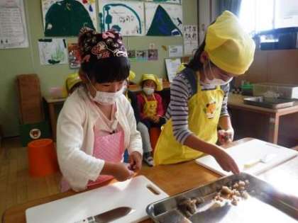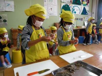 5歳児ゆり組は,今日は昼ごはんに食べるみそ汁をつくりました。