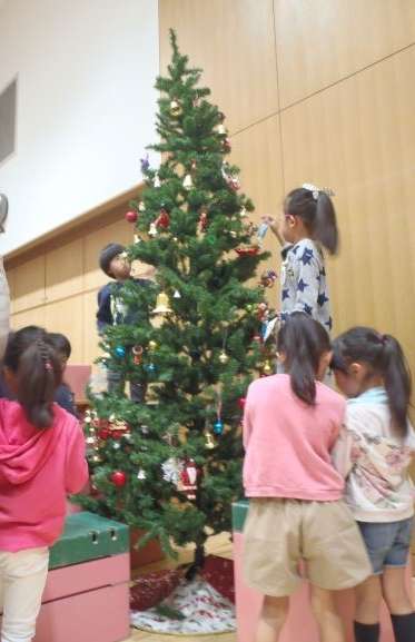 みつば幼稚園の遊戯室に大きなツリーを出し,みんなで飾りました。