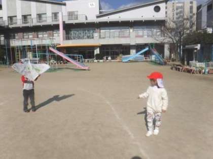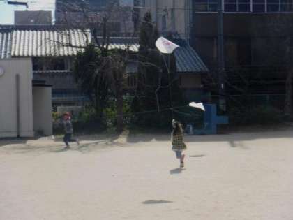 友達と一緒に走ったり,あげるときに友達にたこを支えてもらったり,友達や教師があげているたこを追いかけて走ったり…。「くもがひとつもないね!」という青空の下,広い広場を思い切り走り回って遊んでいました。