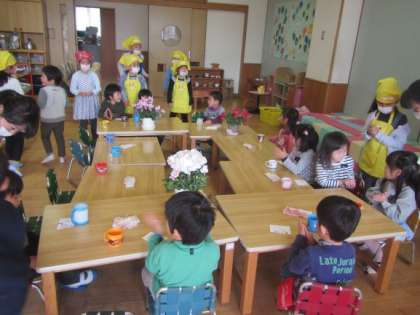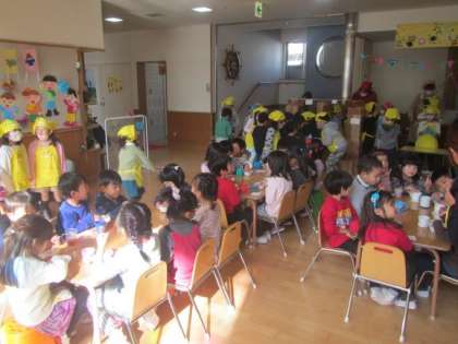 5歳児ゆり組の企画したポップコーンパーティーは大成功!3歳児も4歳児も嬉しそうにポップコーンをほおばりました。