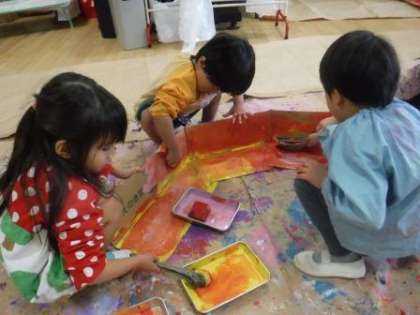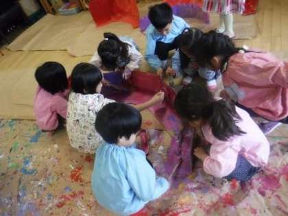 年中児ばら組の子どもたちが,劇あそびに使う道具(自分たちが入っているてぶくろ)に絵の具で色をつけました。「てぶくろ」の遊びで同じ動物になっている仲間と一緒に,「どんな色にする?」「赤にしたらあったかいと思う。」「茶色は?」「え〜いやや。」「じゃあピンクはどう?」「それ,いいね!」など,友達と相談をしながらつくっていました。
