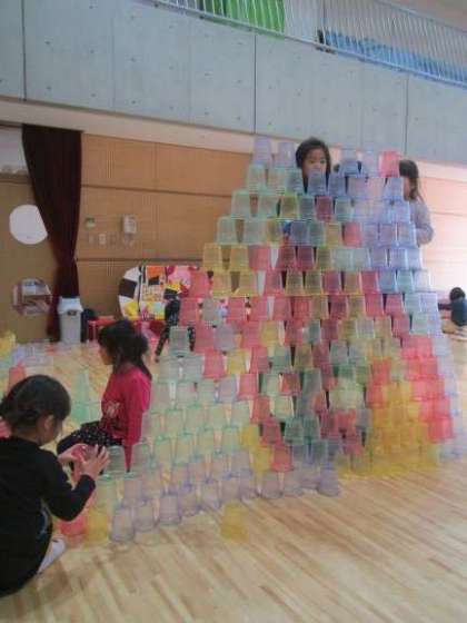 カラーカップを積み上げて自分たちの背の高さよりも高くなってきました。(写真下)