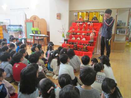 3月3日は日曜日なので,みつば幼稚園では今日,ひなまつりのつどいをしました。みんなでおひな様の前に集まって,おひな様の話を聞いたり歌を歌ったりします。後ろからもおひな様が見守ってくれています。子どもたちがみんな元気に大きくなりますように!いつも変わらぬ大人の願いです。