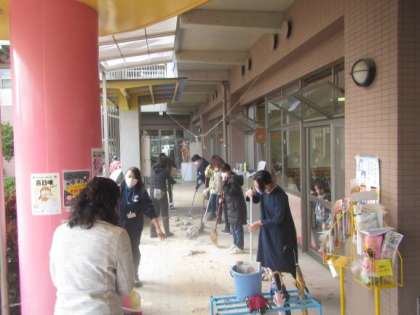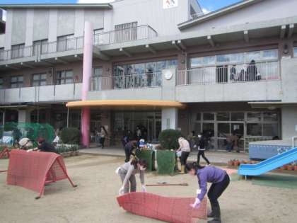 1時間後,みなさんのおかげで,幼稚園はすっきり,とってもきれいになりました。