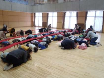 上から物が落ちてこない広いところなので,全員その場でちいさくなり,頭や体を守りました。誕生会に参観に来ていた保護者の方も訓練に参加していただき,一緒に身を守りました。