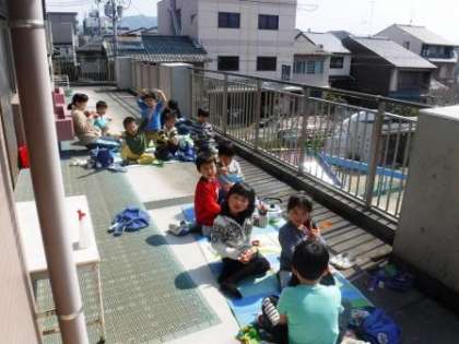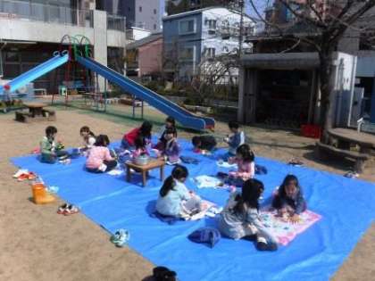 修了式を控えた5歳児ゆり組は,今日は園の色々な場所でお弁当を食べました。
