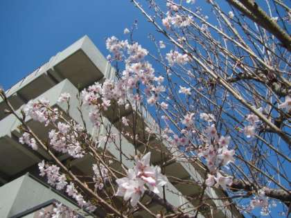 幼稚園の庭の木々の花が満開です。青い空に淡い春の色がとてもきれいです。