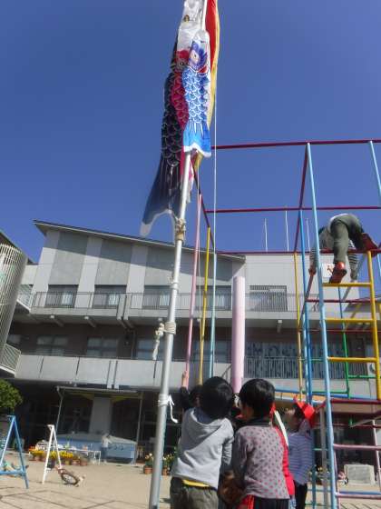 今日は雲一つない良い天気。子どもたちは先生と一緒にこいのぼりをあげました。去年のことを思い出して「黒いのはお父さんやな」「赤いのはお母さんかな?」「じゃあ青いのは子どもってこと?」など話す姿もありました。